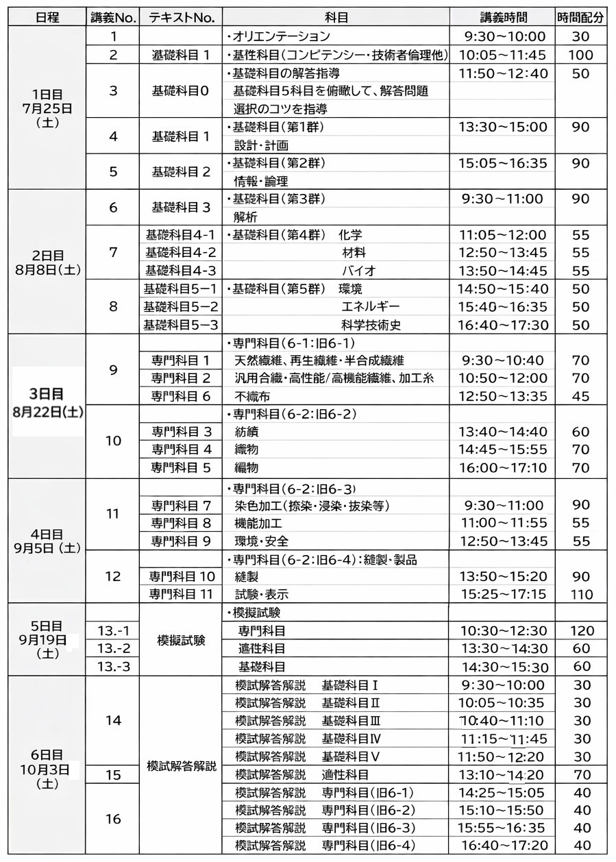 | 講師の関係で講座の順序が変更になる場合があります。その場合は事前にご連絡いたします。 ※ 録画配信、オンデマンド配信は、一切承っておりませんので、ご了承ください。 ※ 本試験実施日:令和8年11月22日(日) 詳しくは、(公社)日本技術士会HPをご確認ください。 令和8年度 技術士第一次試験の実施について|公益社団法人 日本技術士会 https://www.engineer.or.jp/c_topics/010/011423.html |